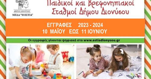 Σας ενημερώνουμε ότι οι εγγραφές των νηπίων και βρεφών στους Παιδικούς και Βρεφονηπιακούς σταθμούς του Ν.Π.Δ.Δ ΚΟΙΠΑΠ ¨Η ΕΣΤΙΑ¨ του Δήμου Διονύσου, για τη σχολική χρονιά 2023-2024 θα ξεκινήσουν εντός του μηνός Μαΐου. Και φέτος, στα πλαίσια του εκσυγχρονισμού του διοικητικού έργου των υπηρεσιών του Ν.Π.Δ.Δ ΚΟΙΠΑΠ ¨Η ΕΣΤΙΑ”, η υποβολή των αιτήσεων θα γίνεται μόνο ψηφιακά και θα πραγματοποιηθεί μέσω της πλατφόρμας preschool η οποία θα είναι ενεργή από 10 Μαίου 2023 έως και 11 Ιουνίου 2023 και ώρα 24:00.