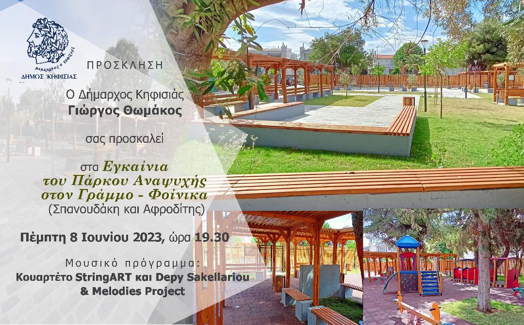 Ένα νέο όμορφο πάρκο αναψυχής παραδίδει ο Δήμος Κηφισιάς στους πολίτες του. Ο Δήμαρχος Κηφισιάς Γιώργος Θωμάκος, μας προσκαλεί στα εγκαίνια την Πέμπτη 8 Ιουνίου 2023 στις 19.30 για να γιορτάσουμε όλοι μαζί στον νέο χώρο αναψυχής στον Δήμο μας.