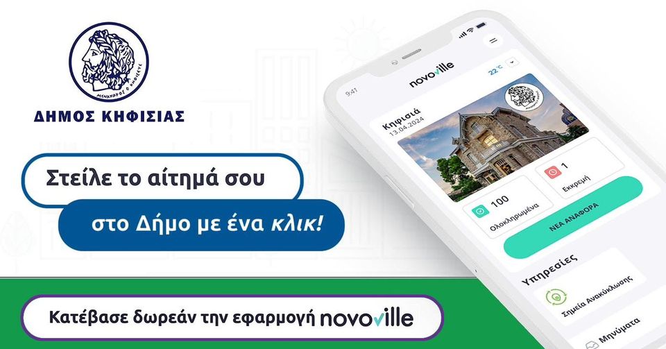 Στο πλαίσιο αυτό, ο Δήμος Κηφισιάς ξεκινά τη λειτουργία της ηλεκτρονικής πλατφόρμας Novoville. Η πλατφόρμα Novoville προσφέρει στους πολίτες τη δυνατότητα αποστολής αιτημάτων, μέσω δωρεάν εφαρμογής για κινητά τηλέφωνα, για τη διευθέτηση ζητημάτων που αφορούν στη λειτουργία της πόλης.