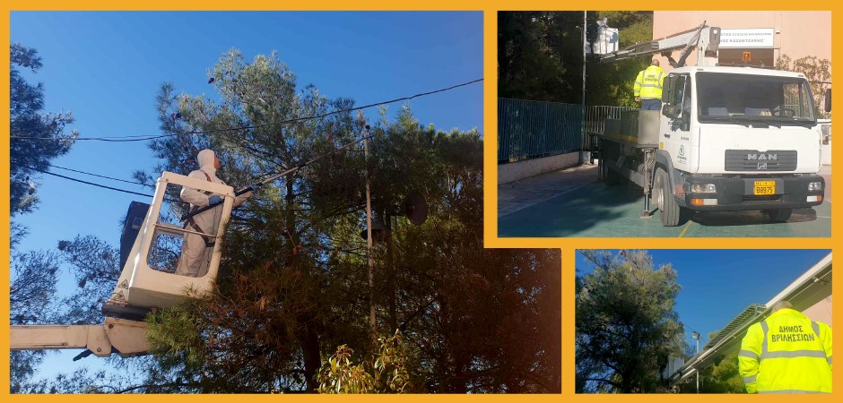 Κλιμάκιο της Υπηρεσίας Πρασίνου με το καλαθοφόρο όχημα του Δήμου Βριλησσίων επεμβαίνει κατά προτεραιότητα σε πεύκα που βρίσκονται στις σχολικές μονάδες της πόλης μας, αλλά και σε συστάδες πεύκων.
