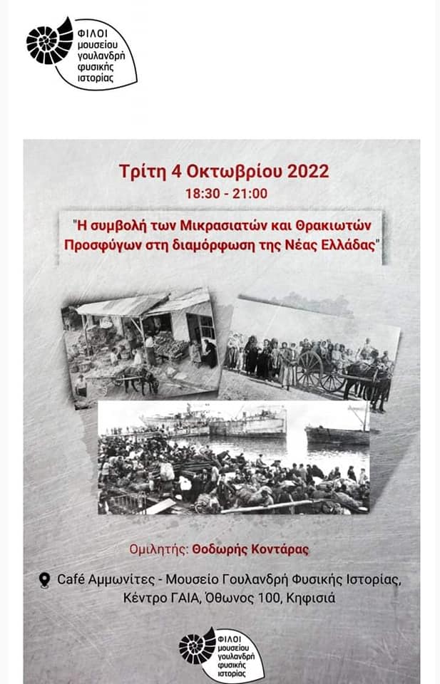 Τρίτη 4 Οκτωβρίου 2022 στις 18.30 Ομιλία του φιλολόγου Θ.Κοντάρα με θέμα ” Η συμβολή των Μικρασιατών και Θρακιωτών προσφύγων…