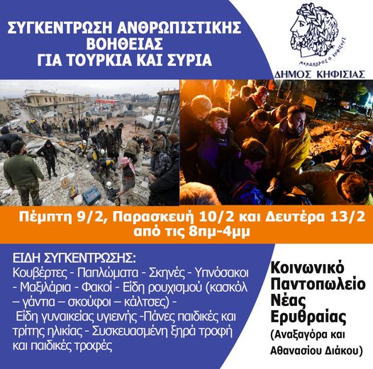 ΣΥΓΚΕΝΤΡΩΣΗ ΑΝΘΡΩΠΙΣΤΙΚΗΣ ΒΟΗΘΕΙΑΣ για τους σεισμόπληκτους της Τουρκίας και της Συρίας Ανείπωτη τραγωδία σε Τουρκία και Συρία. Χιλιάδες νεκροί και…
