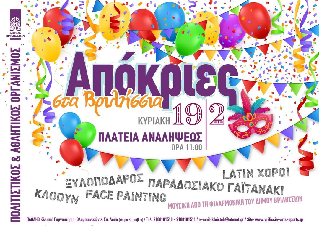 ΑΠΟΚΡΙΑΤΙΚΕΣ ΕΚΔΗΛΩΣΕΙΣ ΣΤΗΝ ΠΛΑΤΕΙΑ ΑΝΑΛΗΨΕΩΣ Κυριακή 19 Φεβρουαρίου 2023 Ώρα έναρξης 11:00 Μετά από 3 χρόνια απουσίας λόγω πανδημίας, ο…