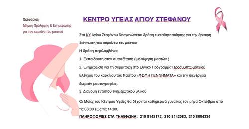 Στο ΚΥ Αγίου Στεφάνου διοργανώνεται δράση ευαισθητοποίησης για την έγκαιρη διάγνωση του καρκίνου του μαστού. Η δράση περιλαμβάνει: Εκπαίδευση στην…