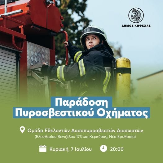 Ο Δήμαρχος Κηφισιάς Βασίλης Ξυπολυτάς σας προσκαλεί στην τελετή παράδοσης – παραλαβής Πυροσβεστικού Οχήματος στην Ομάδα Εθελοντών Δασοπυροσβεστών Διασωστών, που…