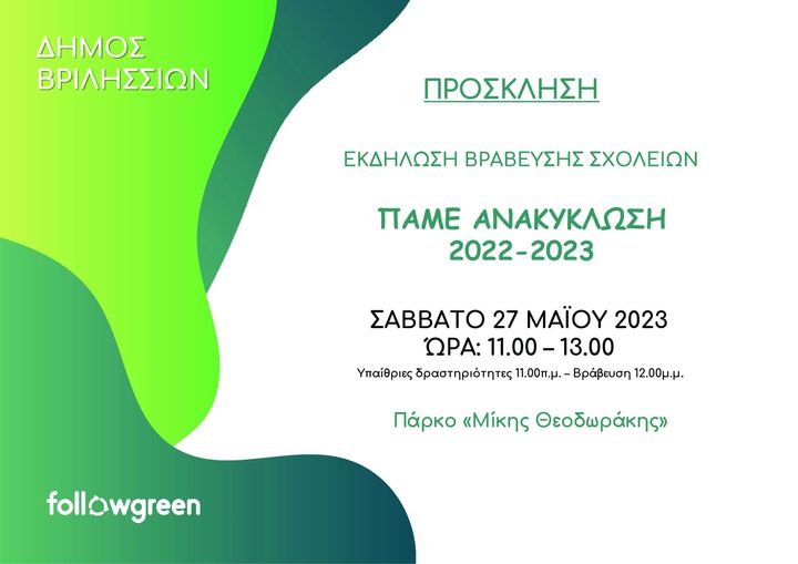 Ο Δήμος Βριλησσίων διοργανώνει γιορτή ανακύκλωσης το Σάββατο 27 Μαΐου 2022 ώρα 11.00π.μ. στο Πάρκο «Μίκης Θεοδωράκης» για τη βράβευση…