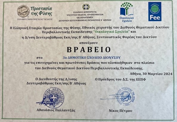 Το 3ο Δημοτικό Σχολείο Διονύσου, όντας ιδιαίτερα ευαισθητοποιημένο στα οικολογικά θέματα του πλανήτη και της περιοχής μας, συμμετείχε στο Διεθνές…