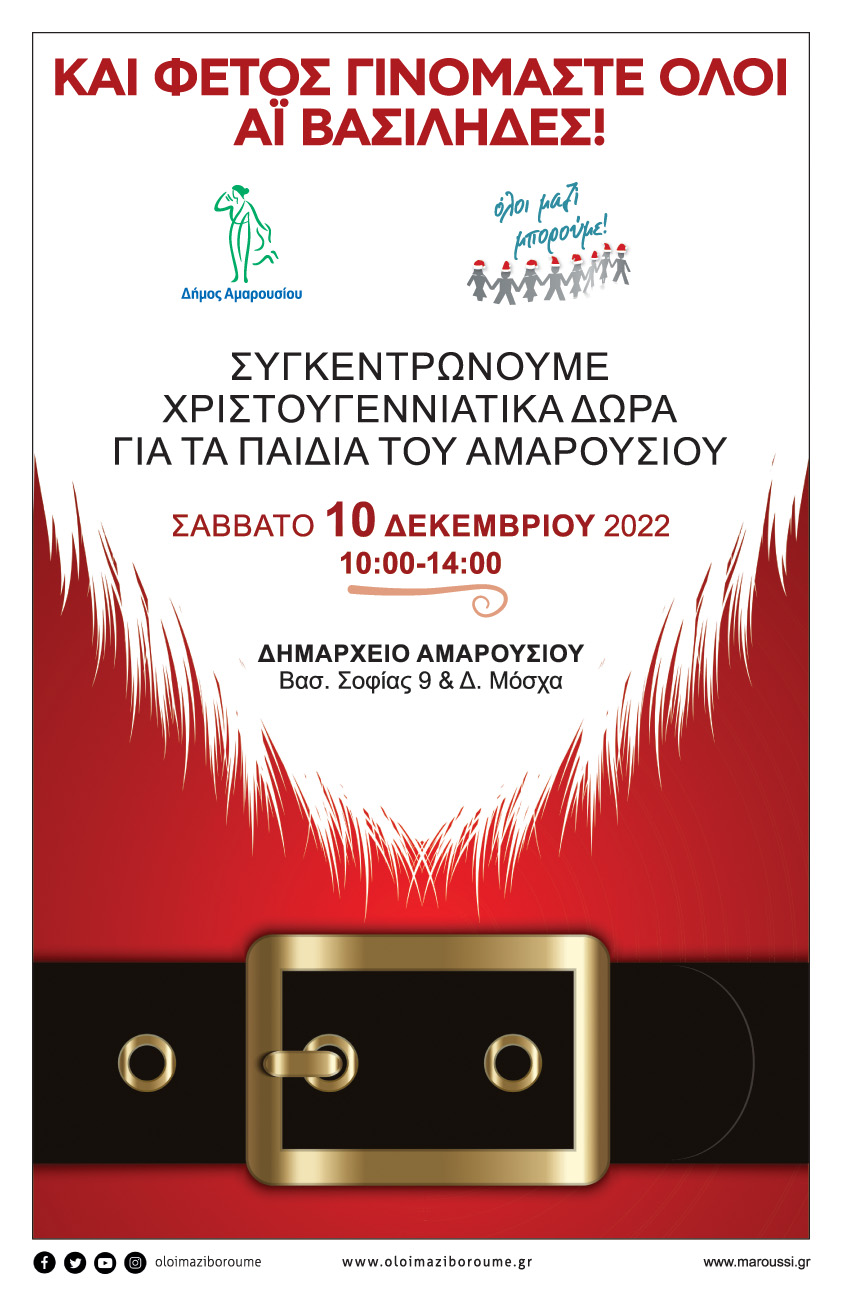 Ο Δήμος Αμαρουσίου συμμετέχει στη δράση του «Όλοι Μαζί Μπορούμε» για τη συγκέντρωση Χριστουγεννιάτικων Δώρων, ενόψει της εορταστικής περιόδου.